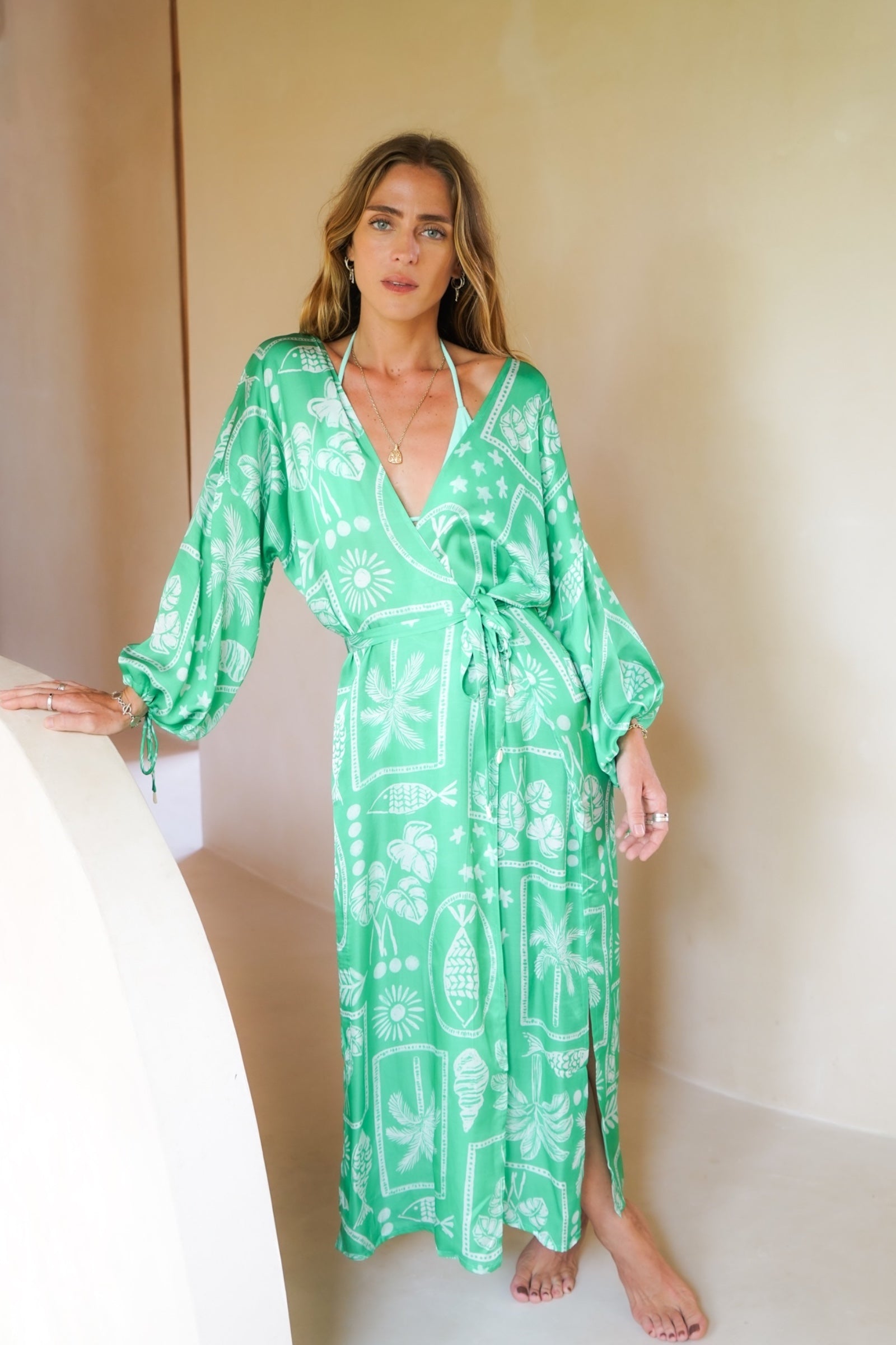The Paradiso Wrap Dress is a long, fluid silhouette designed to transition seamlessly from beach to evening. Cut with a deep V neckline and soft kimono sleeves, the sleeves feature adjustable ties at the cuff, allowing you to gather and shape them into a refined, elevated finish. A subtle side split adds movement and elongates the line.