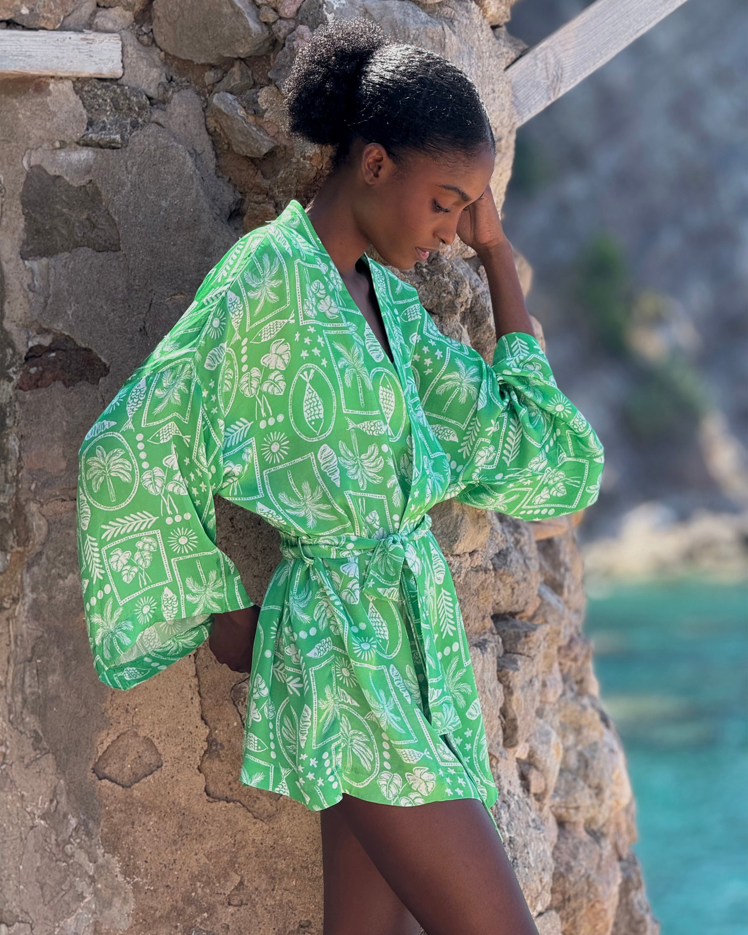 A versatile statement piece designed to move seamlessly from beach to aperitivo. The Paradiso Short Satin Kimono is cut in our signature island inspired print, inspired by Mediterranean escapes and sun-washed coastlines.